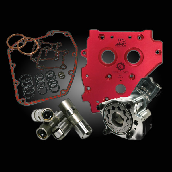 - Increases oil flow and volume by enlarging the oil pump reservoirs and critical oil passages including matching the oil port holes throughout the camplate to the port holes in the engine case which increases engine oil flow to the lifters, piston cooling jets, crankshaft and rod bearings