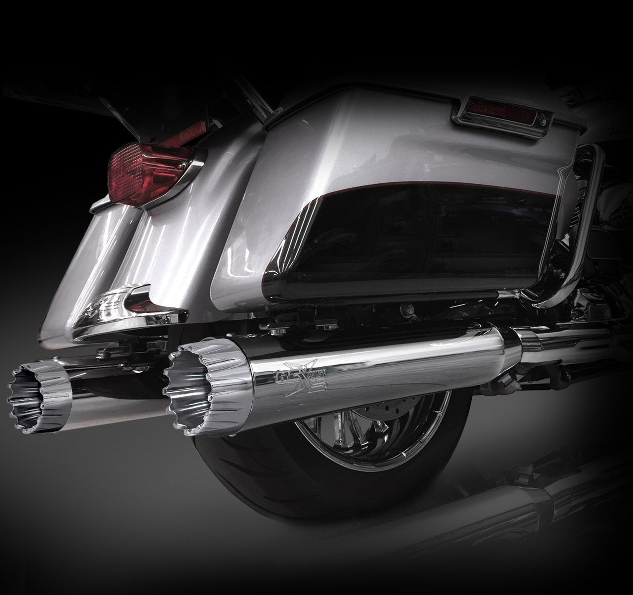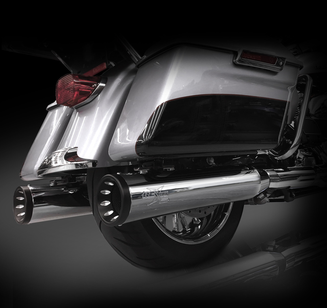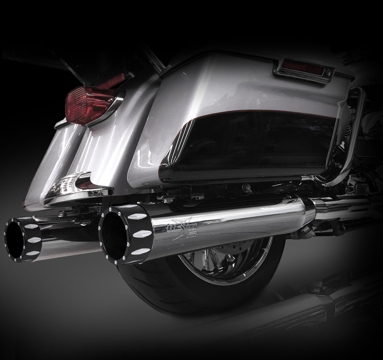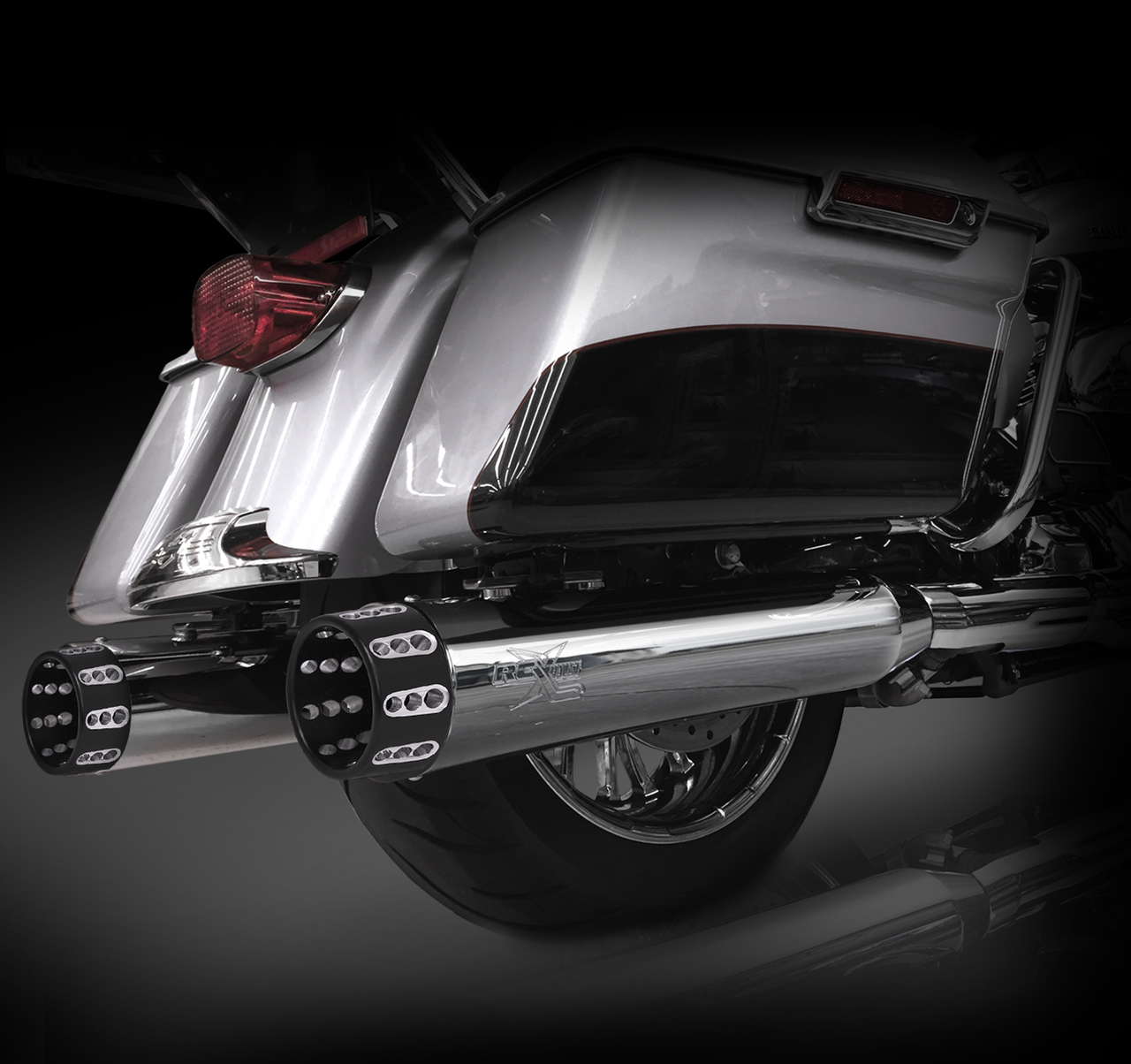 The RCX Exhaust 4.5” Slip-on Mufflers are truly unique in design while offering an incredibly deep and smooth exhaust tone. Each muffler features a full length 4.5″ diameter muffler body with a precision tuned 3 inch stepped core baffle. This unique baffle design transitions from a 2.5 inch louvered core into a ceramic wrapped 3 inch perforated baffle, which works to produce a deep smooth rumble while providing you with increased horsepower and torque. Customize the look of these new mufflers with your choice of 10 unique RCX Exhaust tips. Each muffler is available in chrome or a rich ceramic black finish. Fits all 1995-Newer HD Touring Models. Made in the U.S.A. All RCX Exhaust products offer a structural Lifetime Warranty.