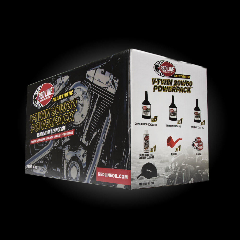 - Includes 5 quarts of 20W60 Motorcycle Oil, 1 quart of V-Twin Transmission Oil with ShockProof, 1 quart of Primary Chain Case Oil, 1 bottle of Fuel Injection Cleaner for Powersports, a sticker kit, a Red Line Oil embroidered hat and a versatile funnel